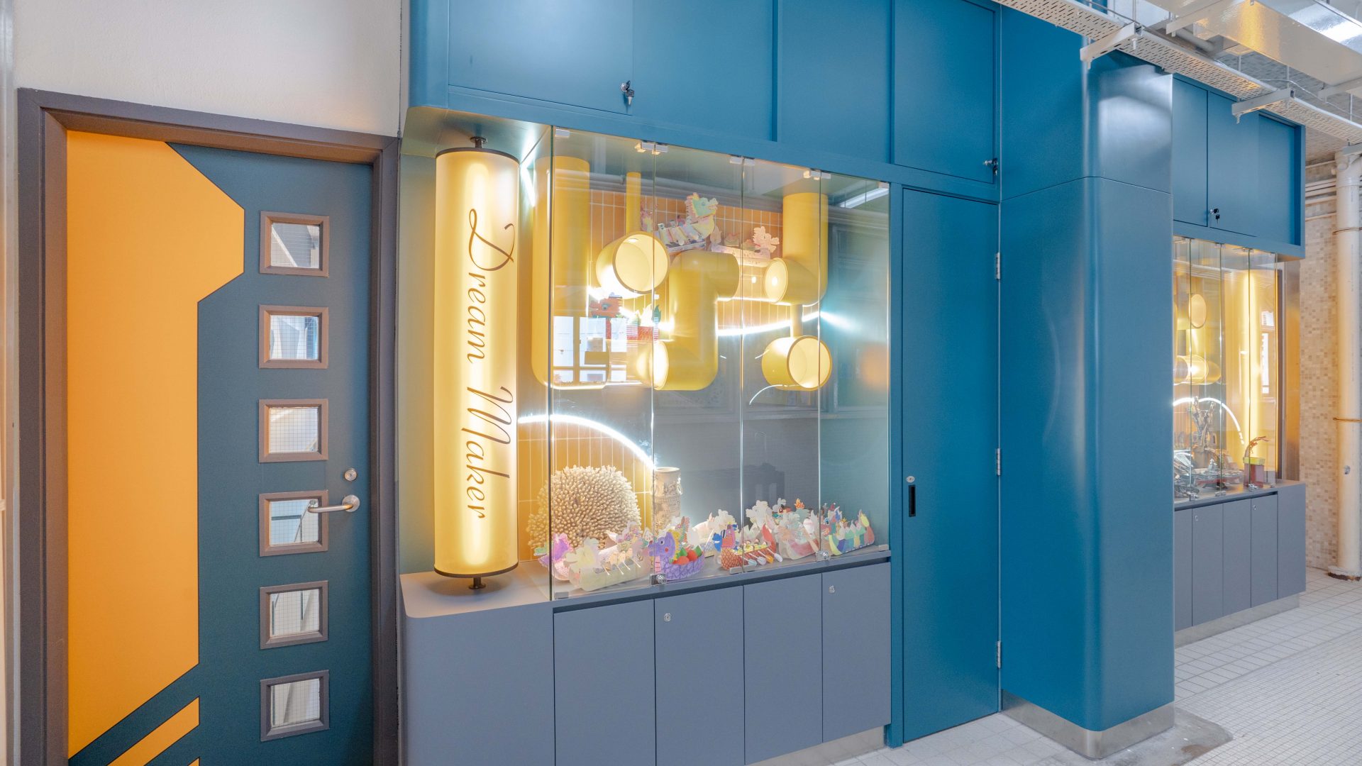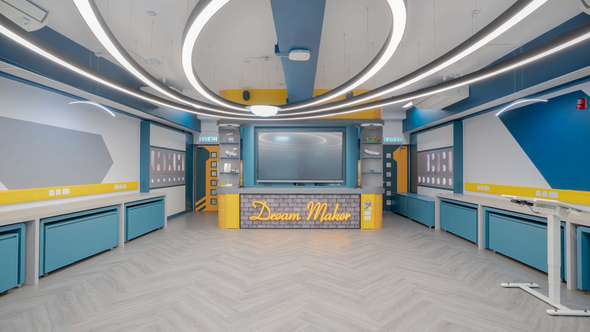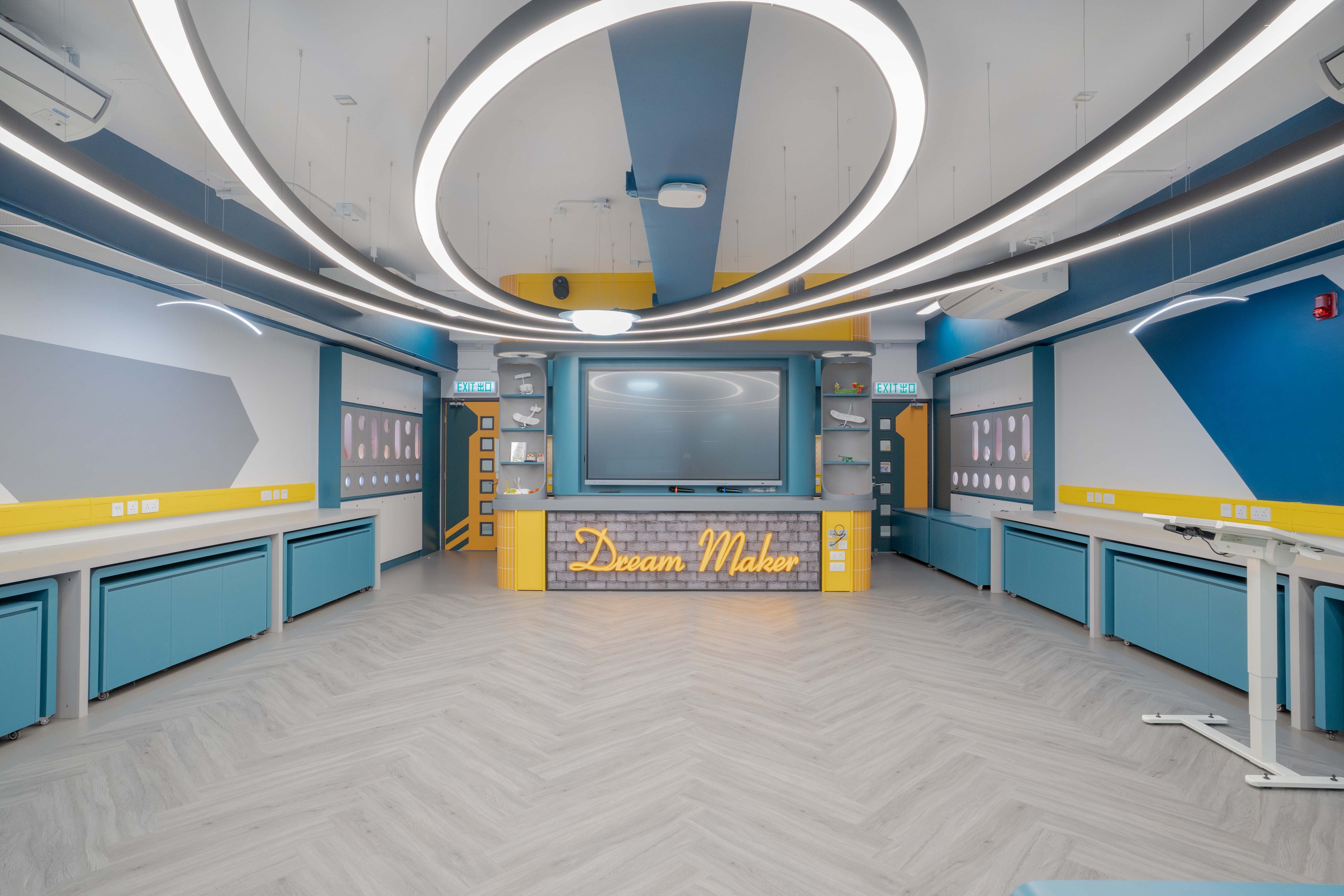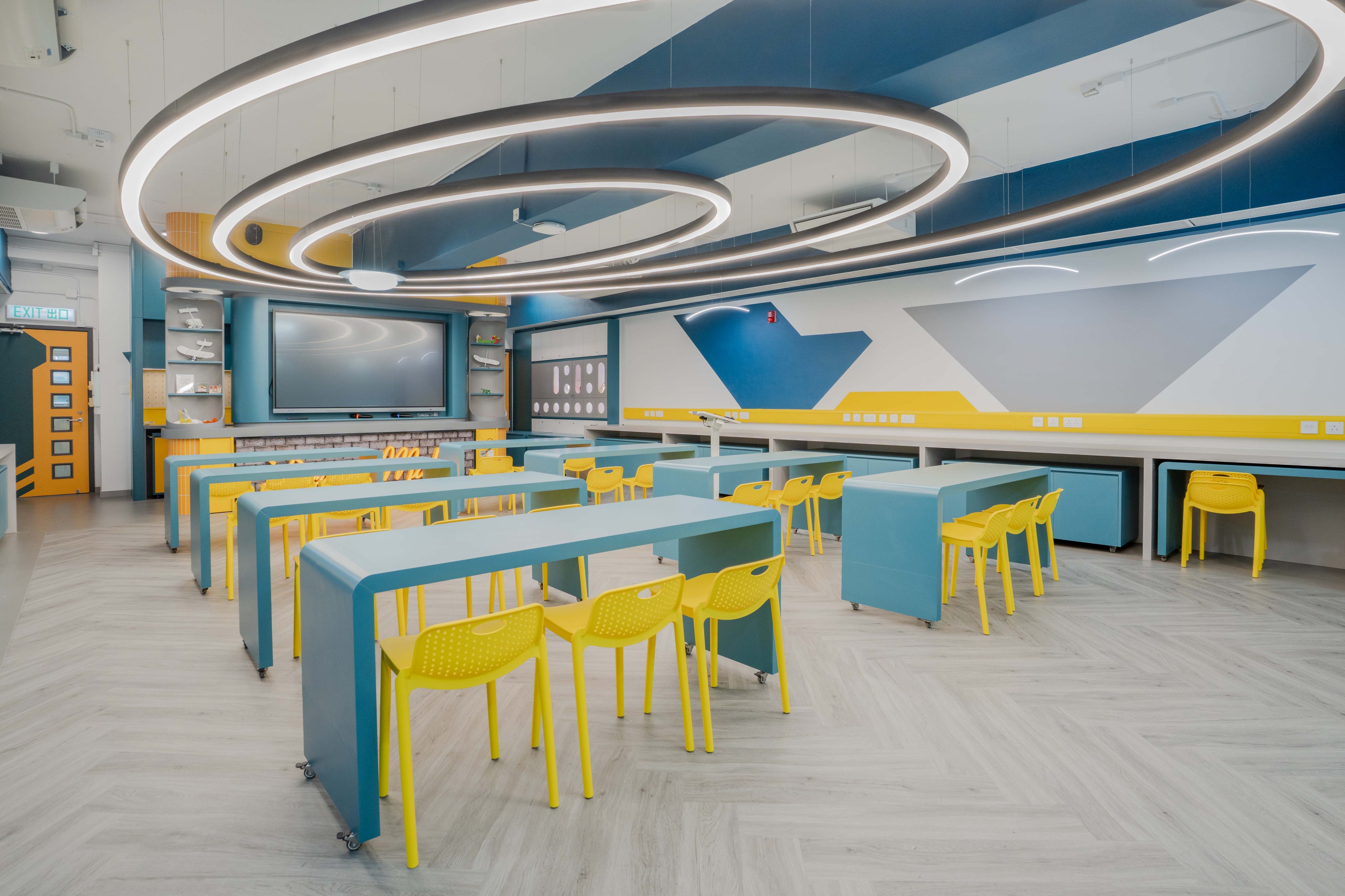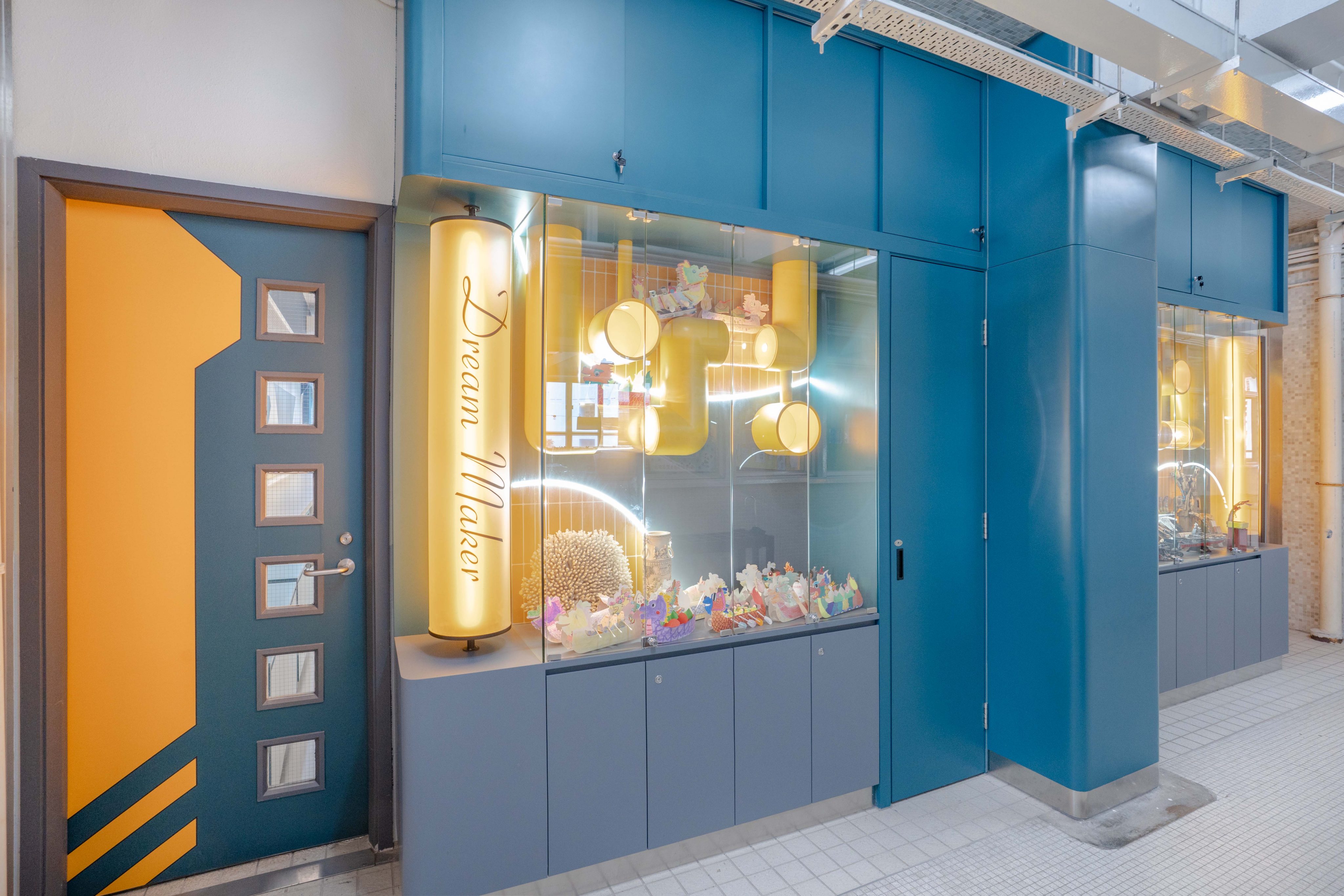課室加入潛艇和現代化工作室設計,運用藍和黃色為主調,呈現簡約而實用的風格。門外特色牆牆邊設有多個展示或儲物單元,藍色檯面搭配黃色水管,展現極簡美感。