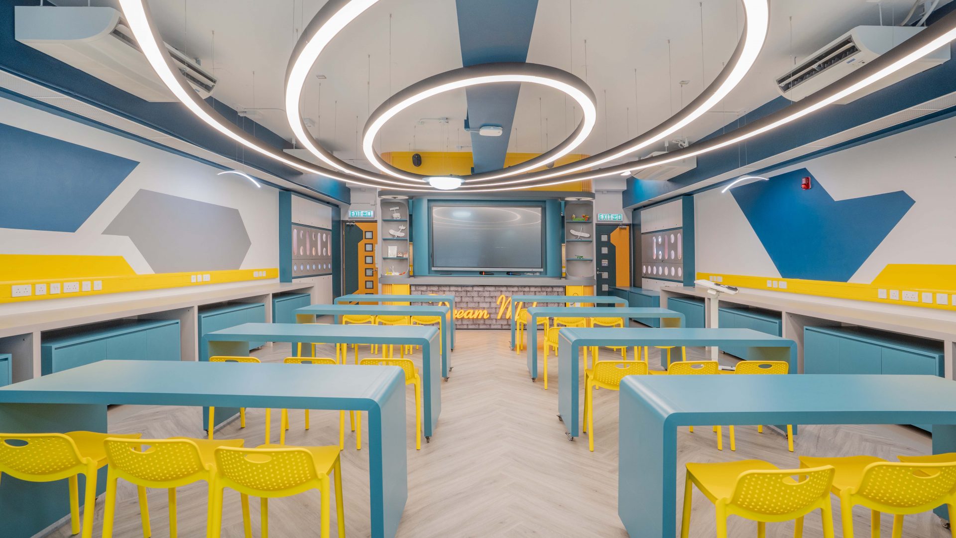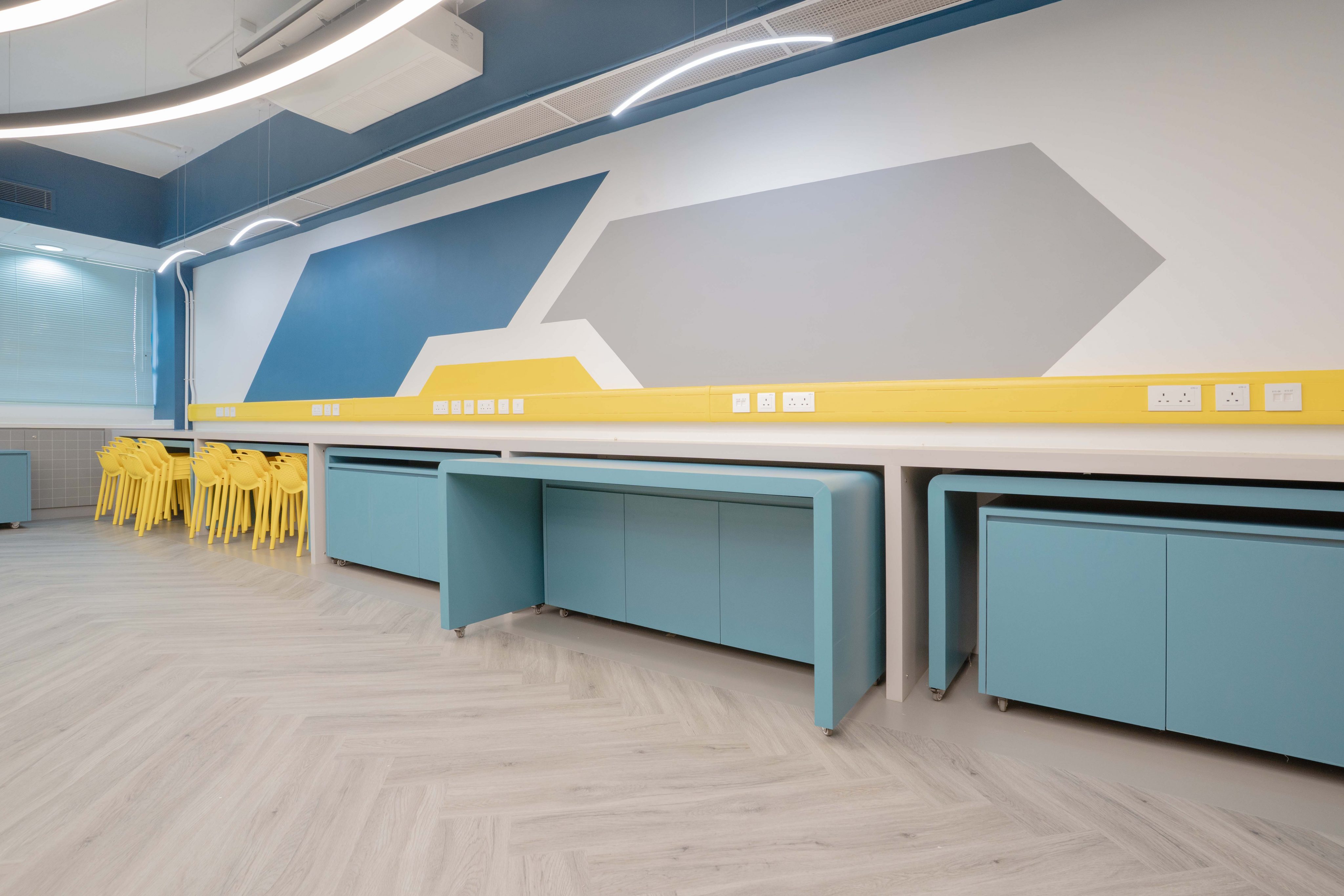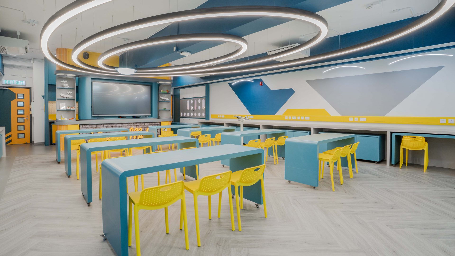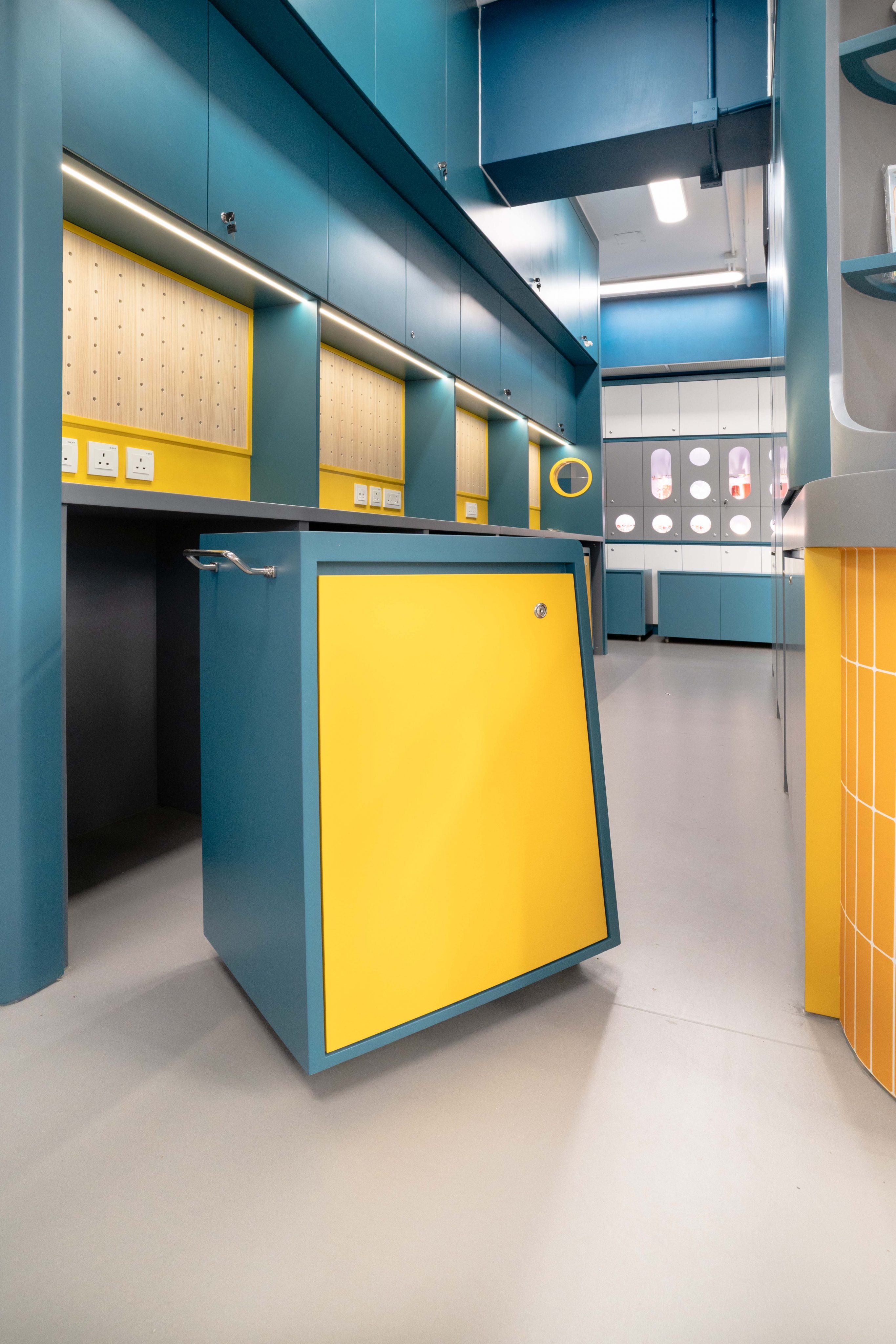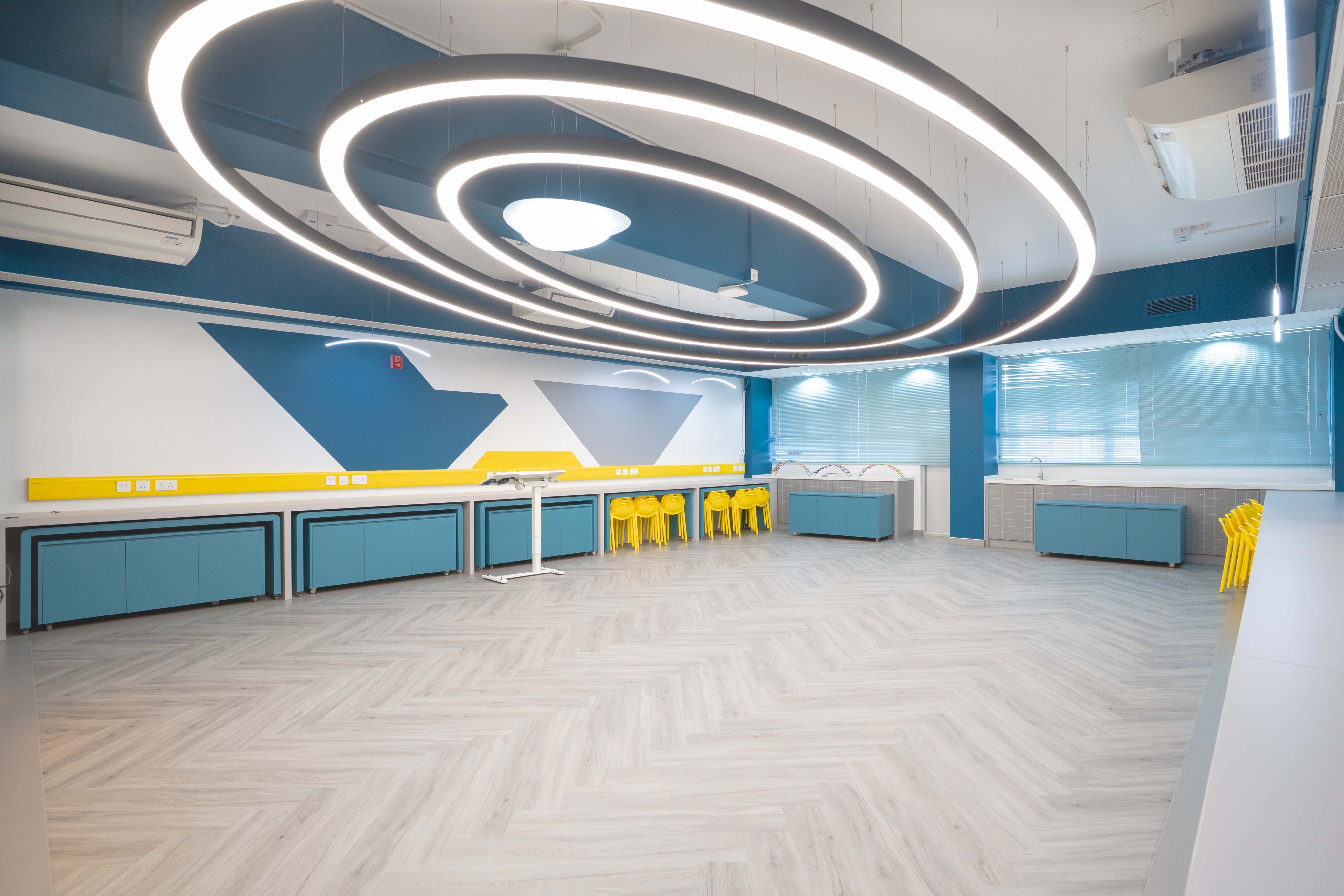 課室加入潛艇和現代化工作室設計,運用藍和黃色為主調,呈現簡約而實用的風格。門外特色牆牆邊設有多個展示或儲物單元,藍色檯面搭配黃色水管,展現極簡美感。