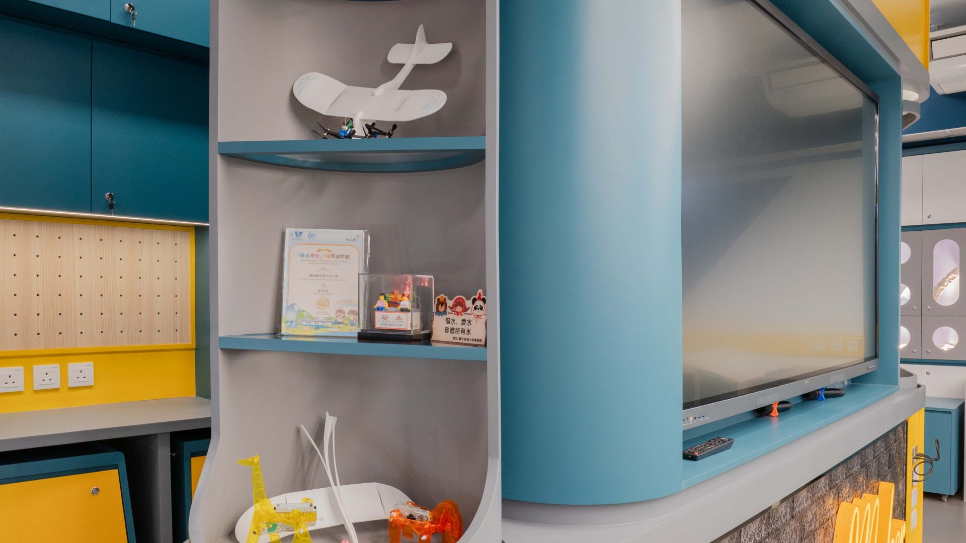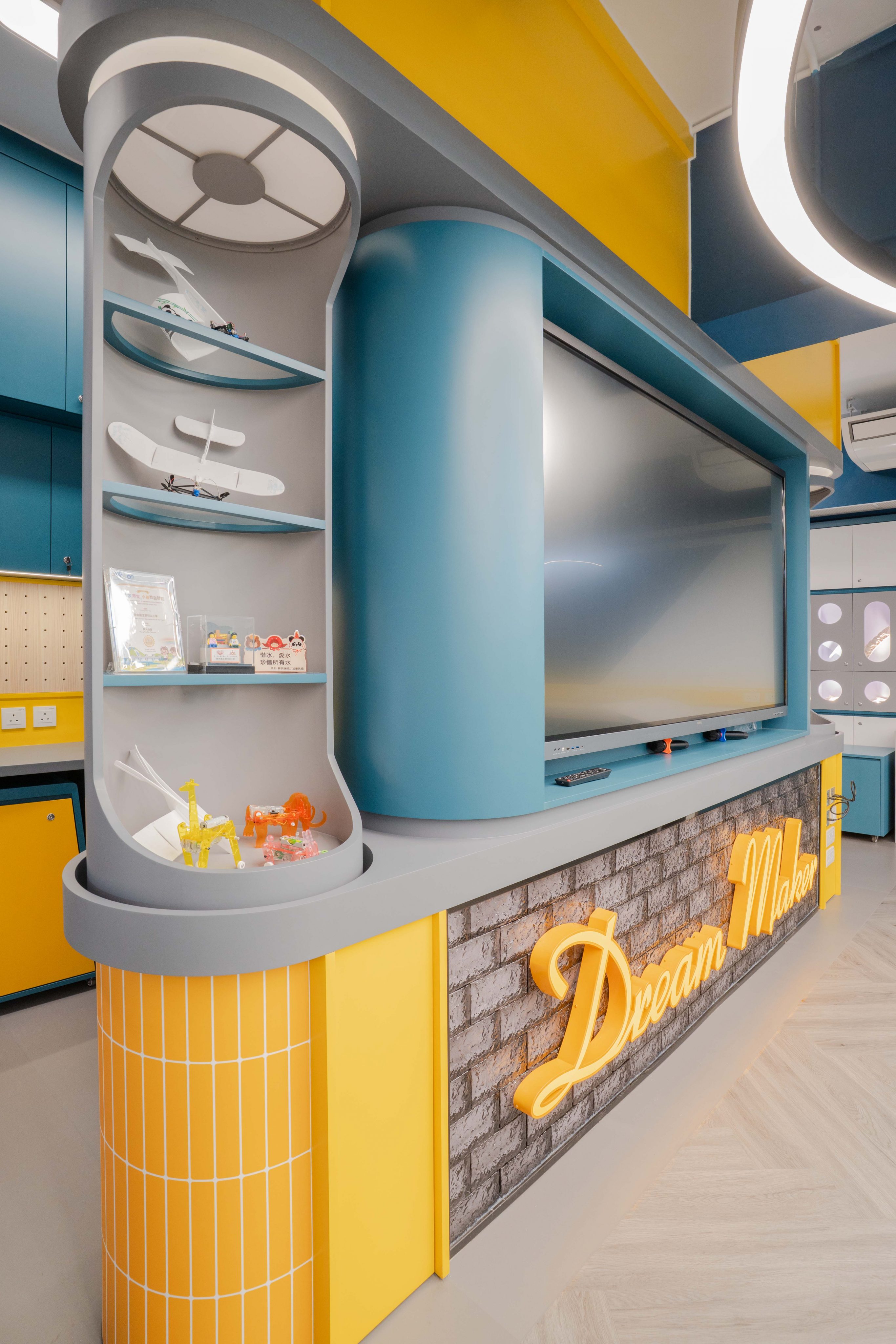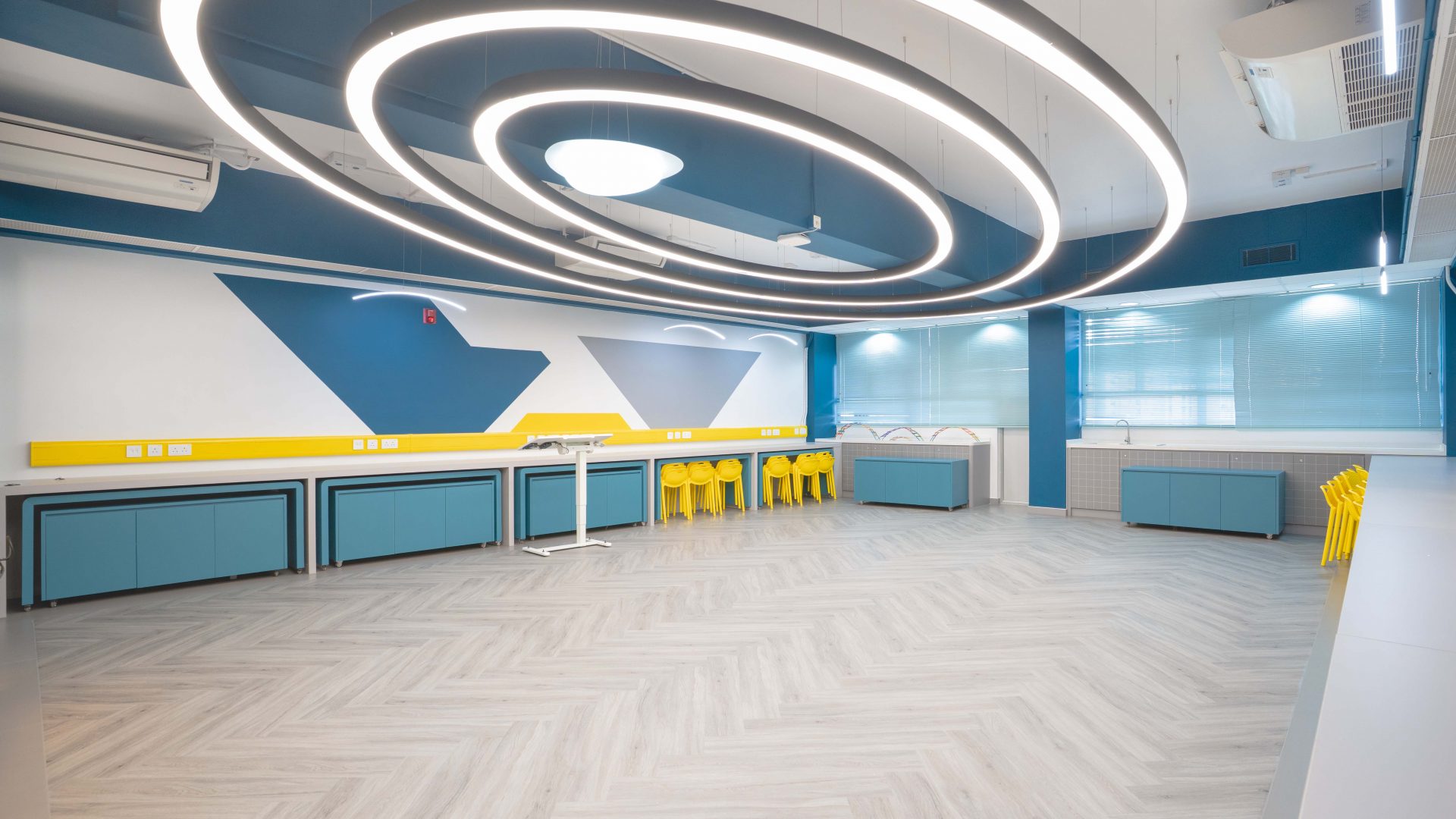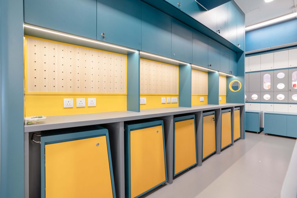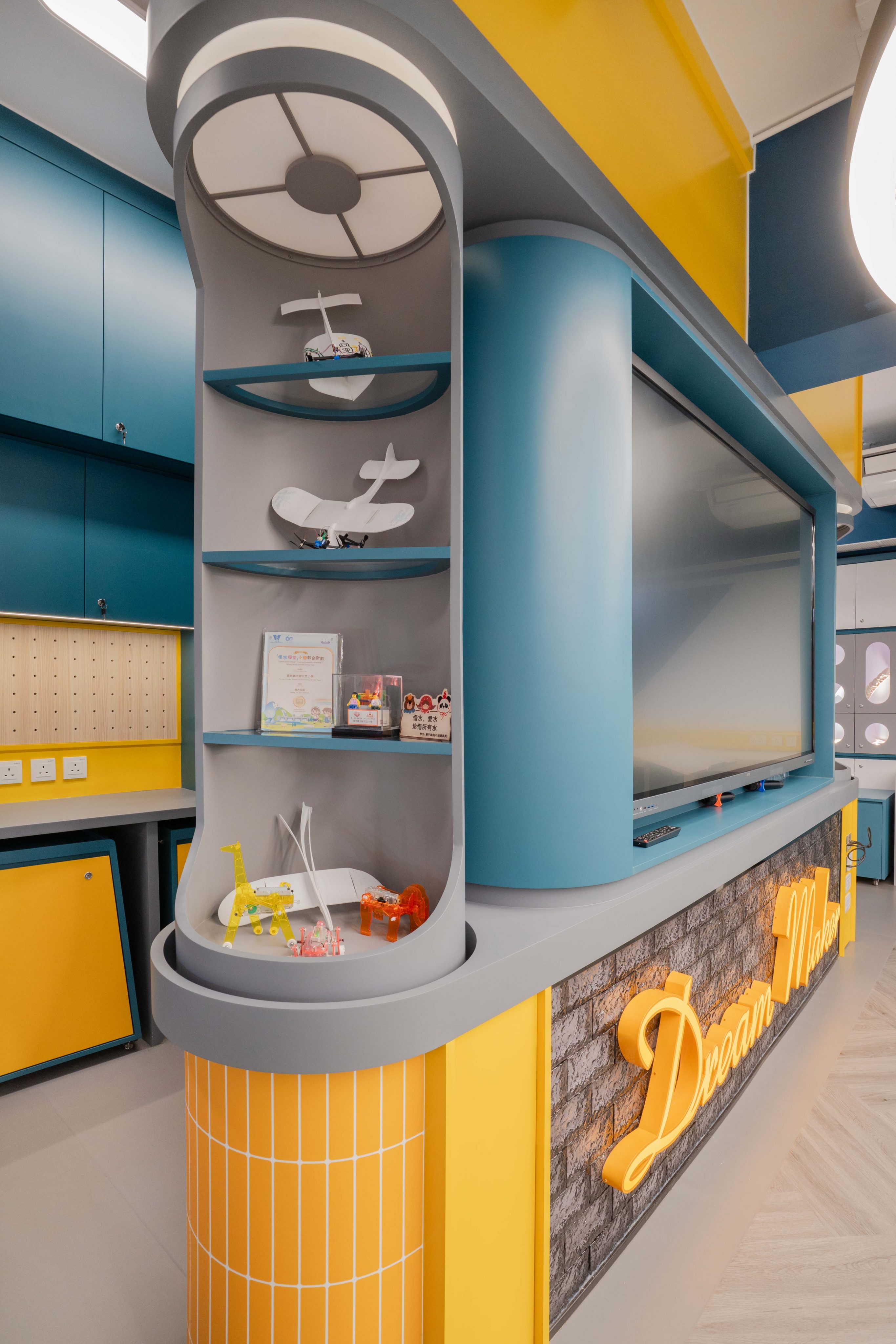 課室加入潛艇和現代化工作室設計,運用藍和黃色為主調,呈現簡約而實用的風格。門外特色牆牆邊設有多個展示或儲物單元,藍色檯面搭配黃色水管,展現極簡美感。