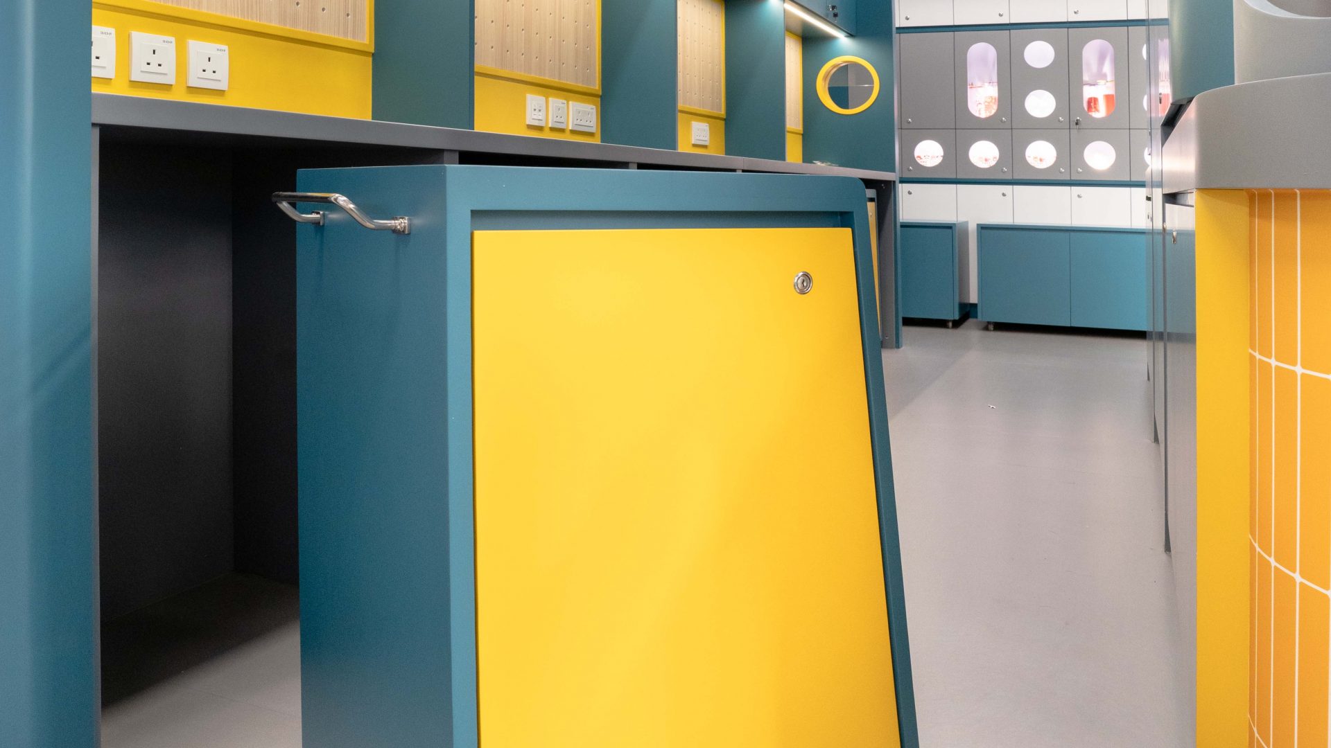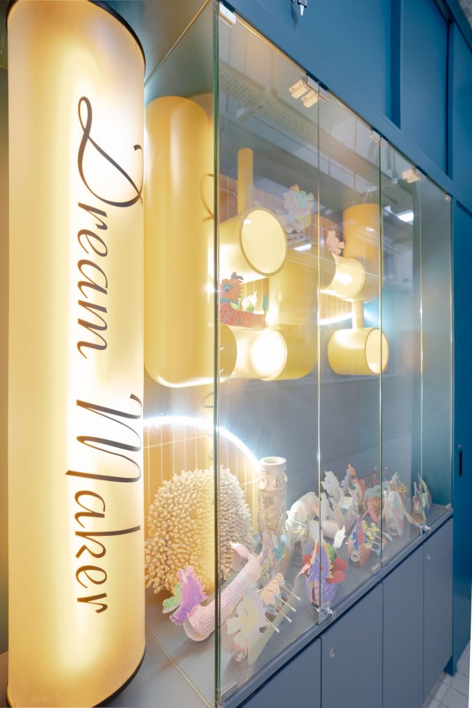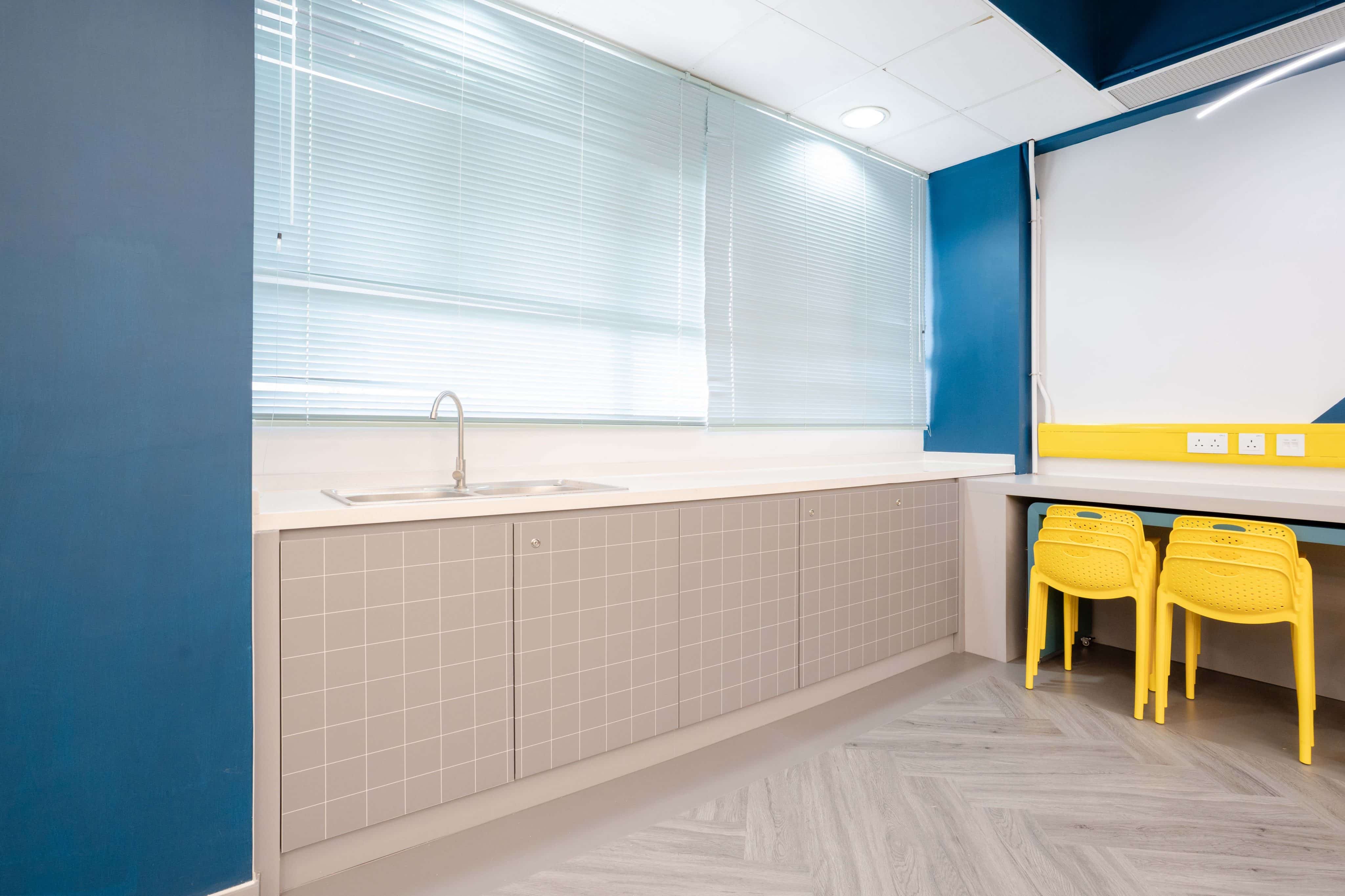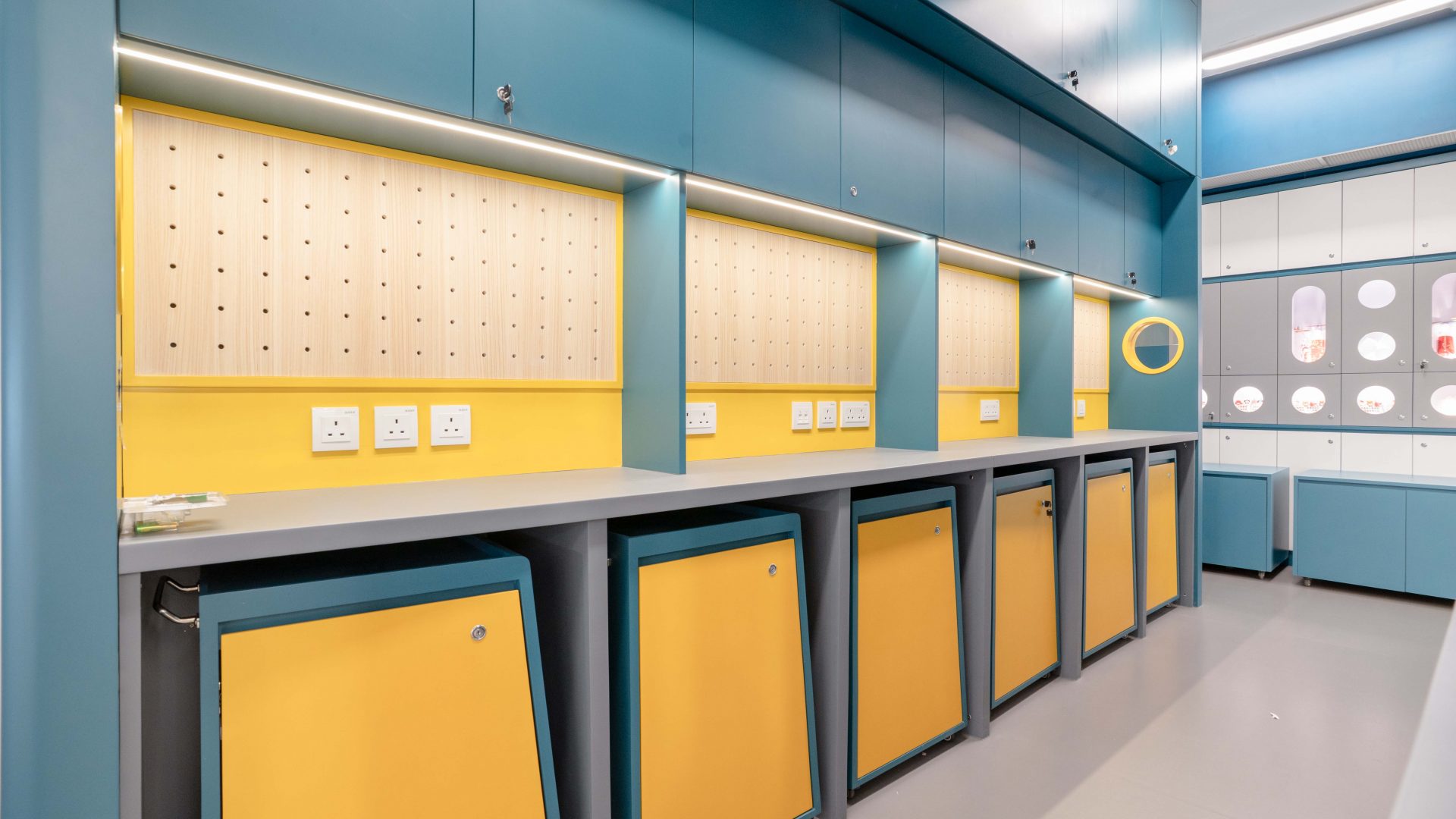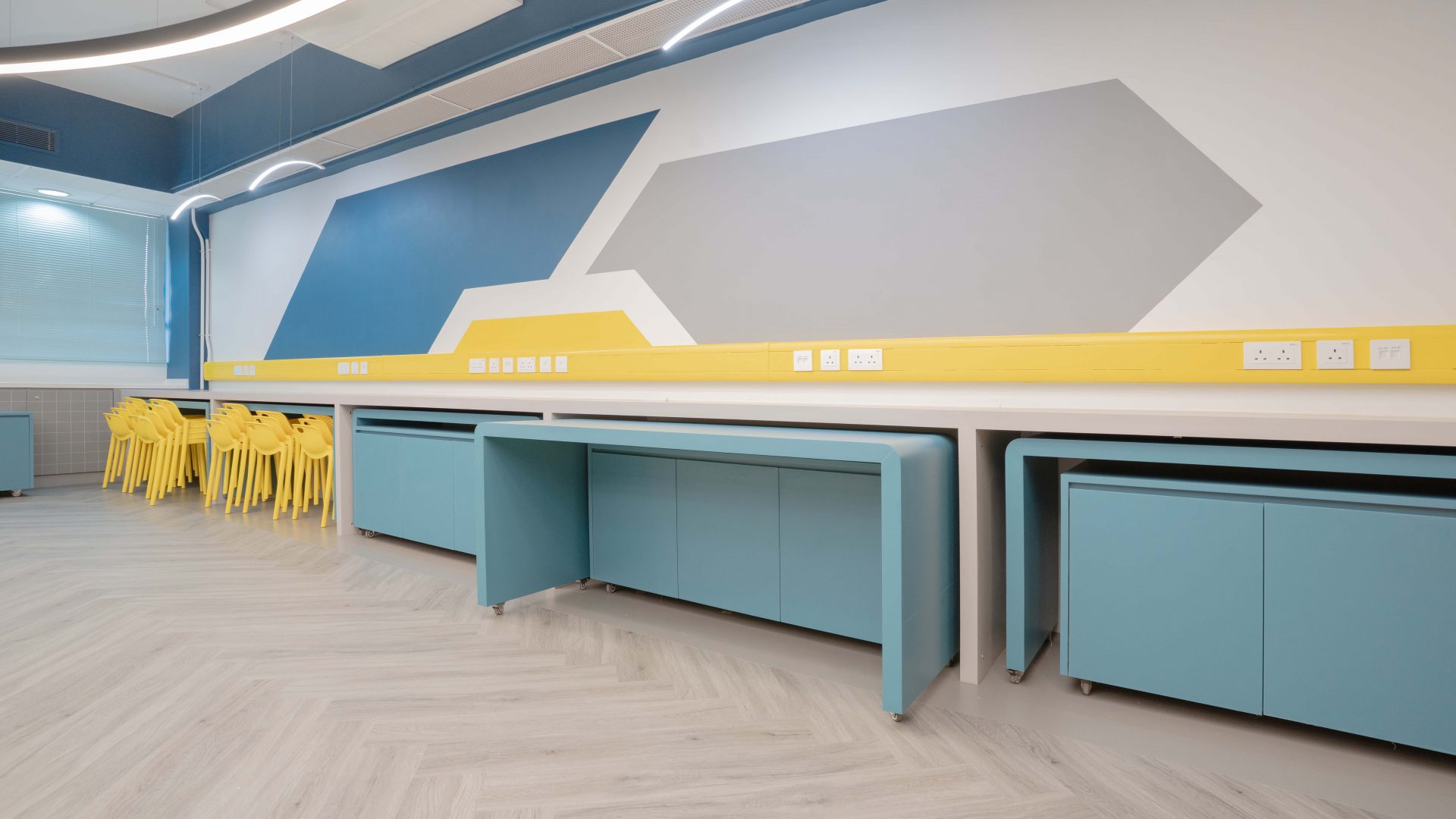課室加入潛艇和現代化工作室設計,運用藍和黃色為主調,呈現簡約而實用的風格。門外特色牆牆邊設有多個展示或儲物單元,藍色檯面搭配黃色水管,展現極簡美感。