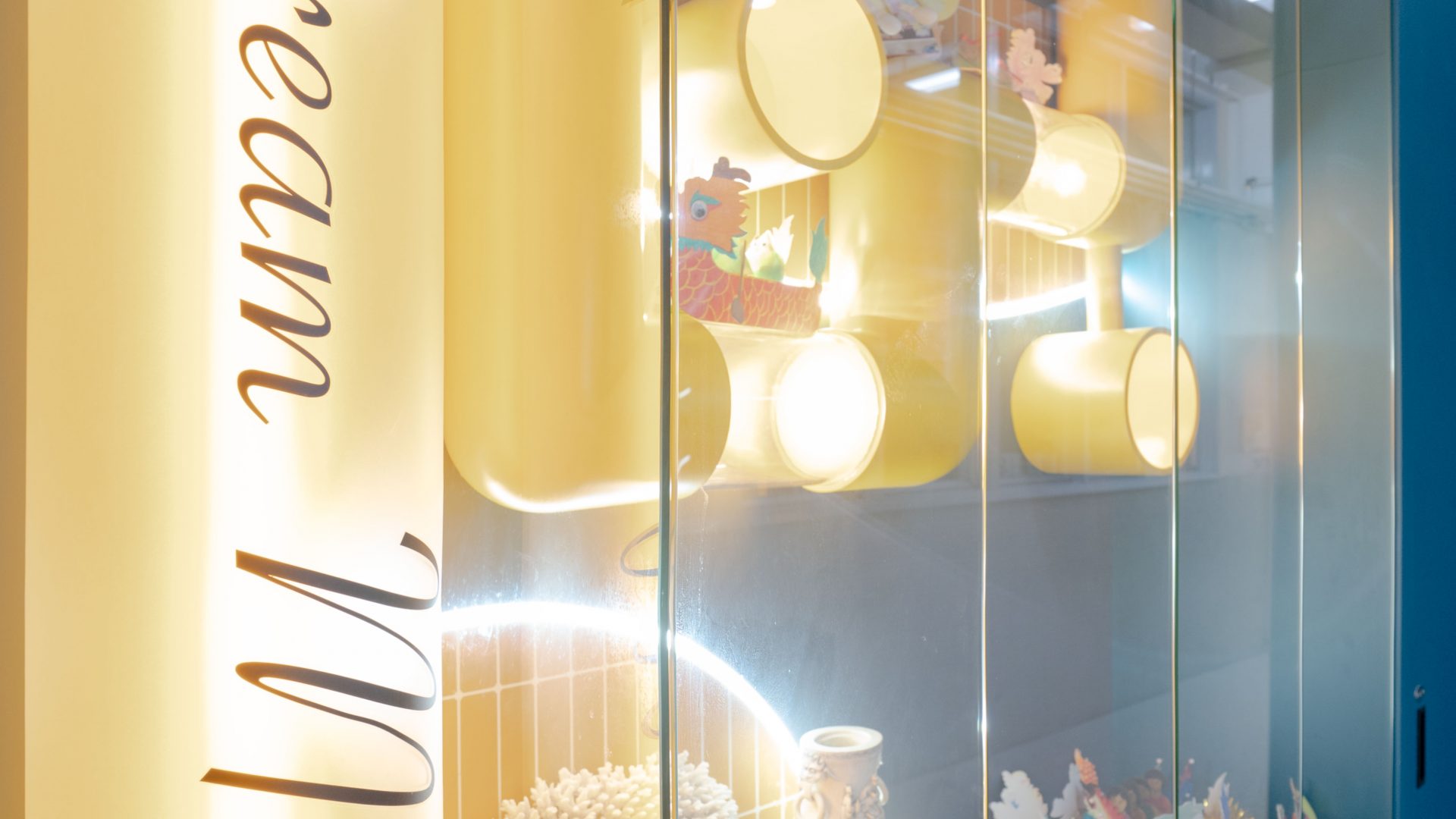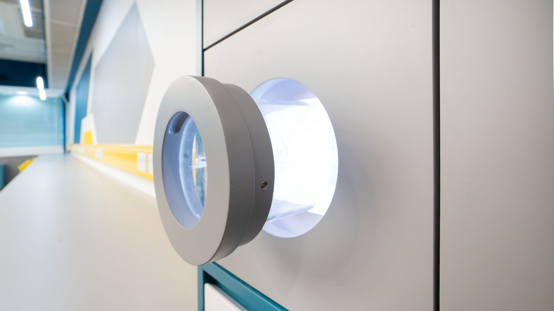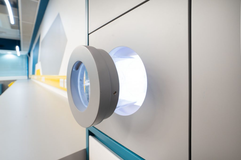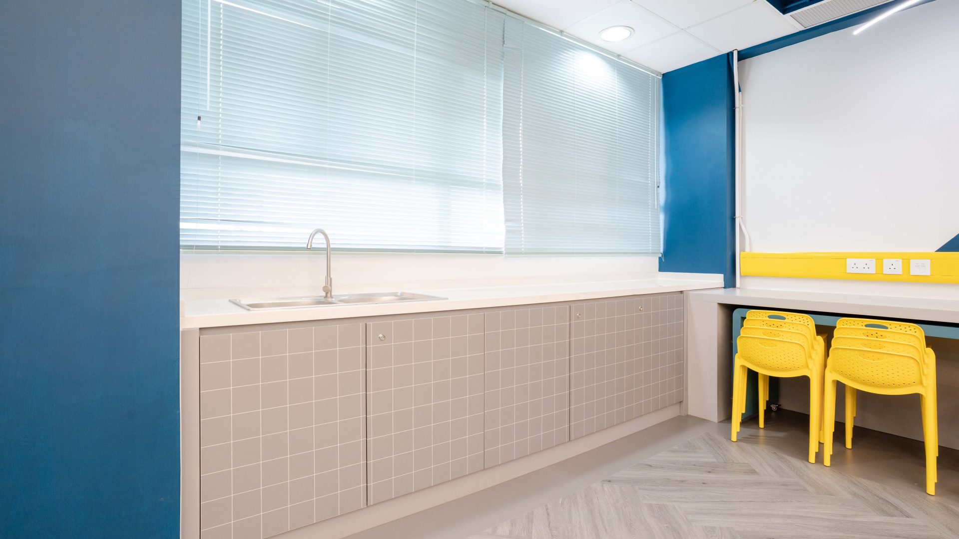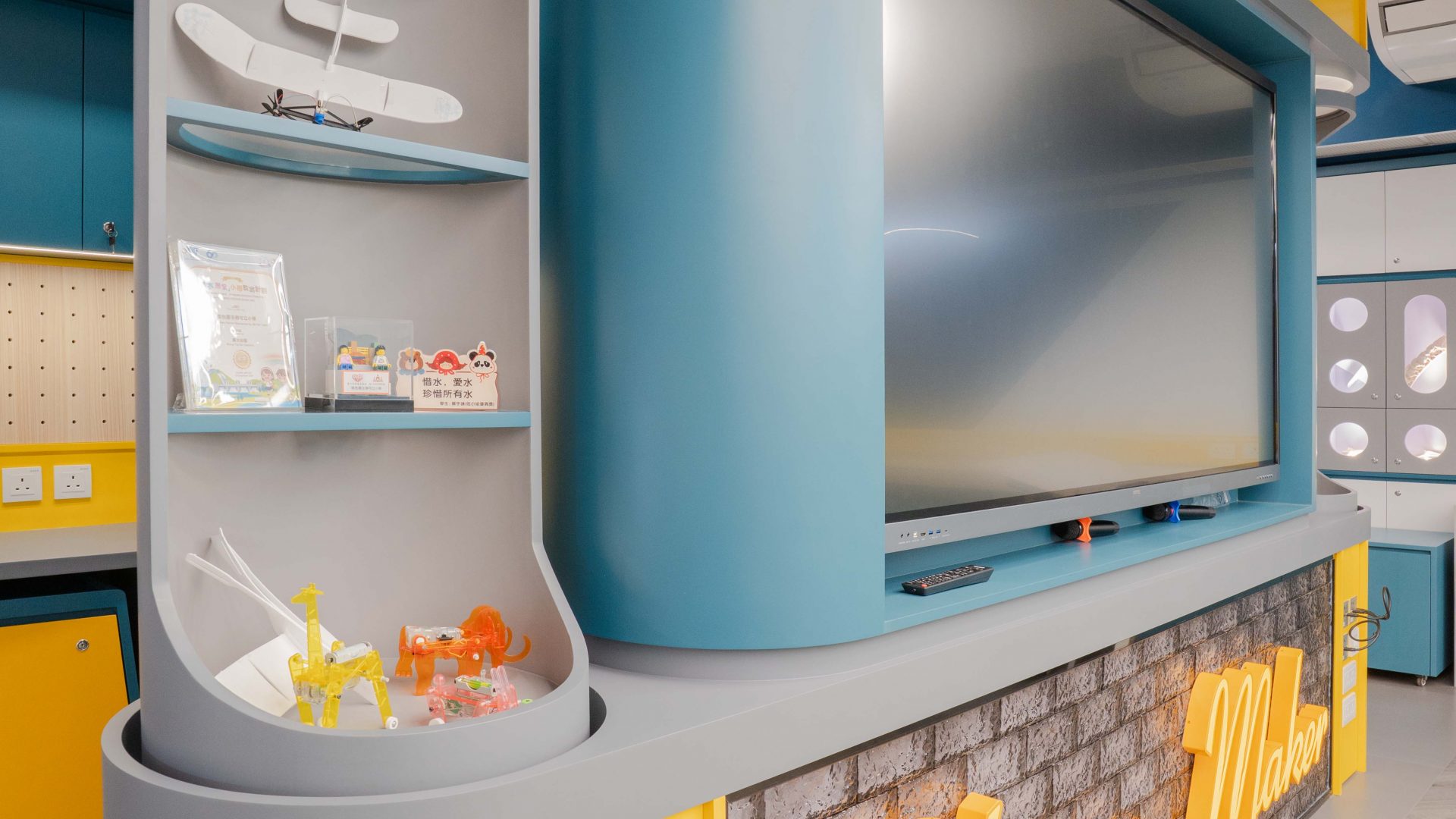 課室加入潛艇和現代化工作室設計,運用藍和黃色為主調,呈現簡約而實用的風格。門外特色牆牆邊設有多個展示或儲物單元,藍色檯面搭配黃色水管,展現極簡美感。
