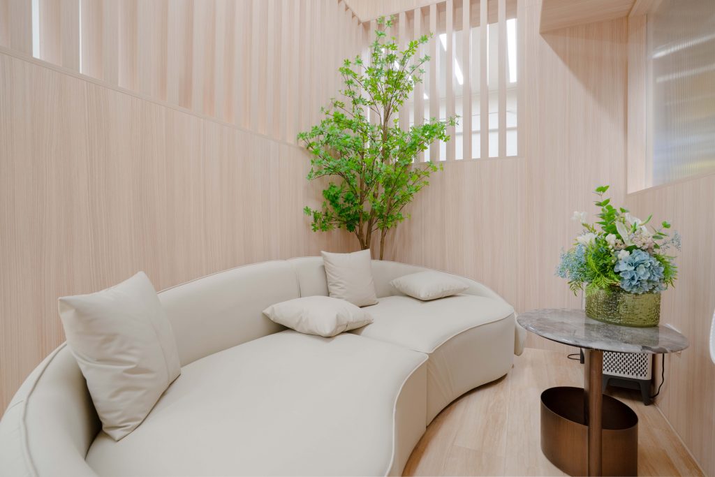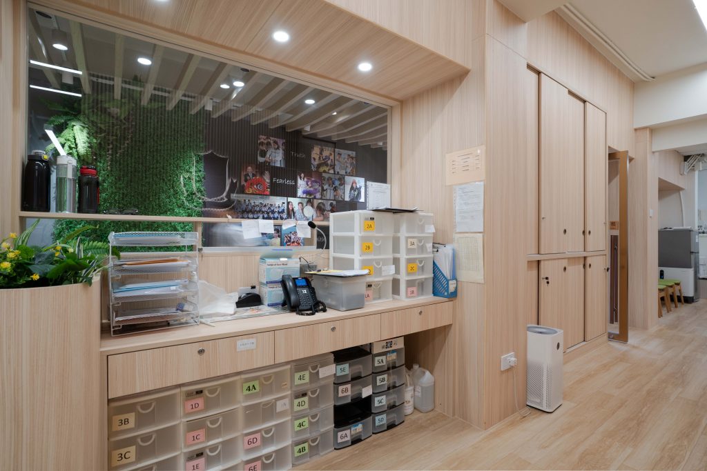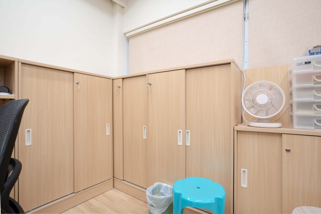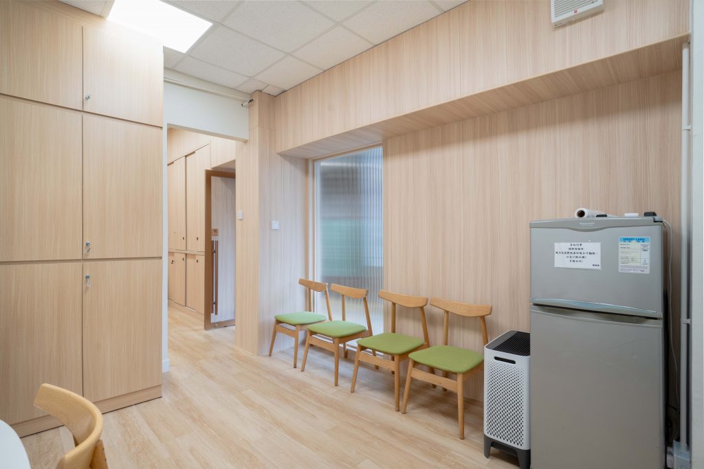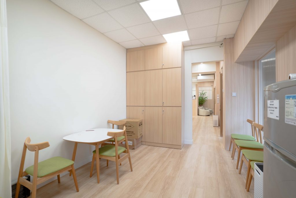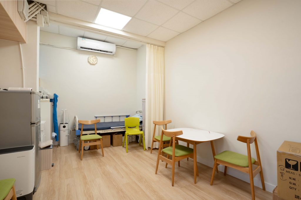 靠牆設有一張醫療床,旁邊配有儲物櫃,儲存醫療用品,確保實用性。綠色與白色相間的窗簾分隔了休息區與工作區,兼具隱私保護與美觀效果。